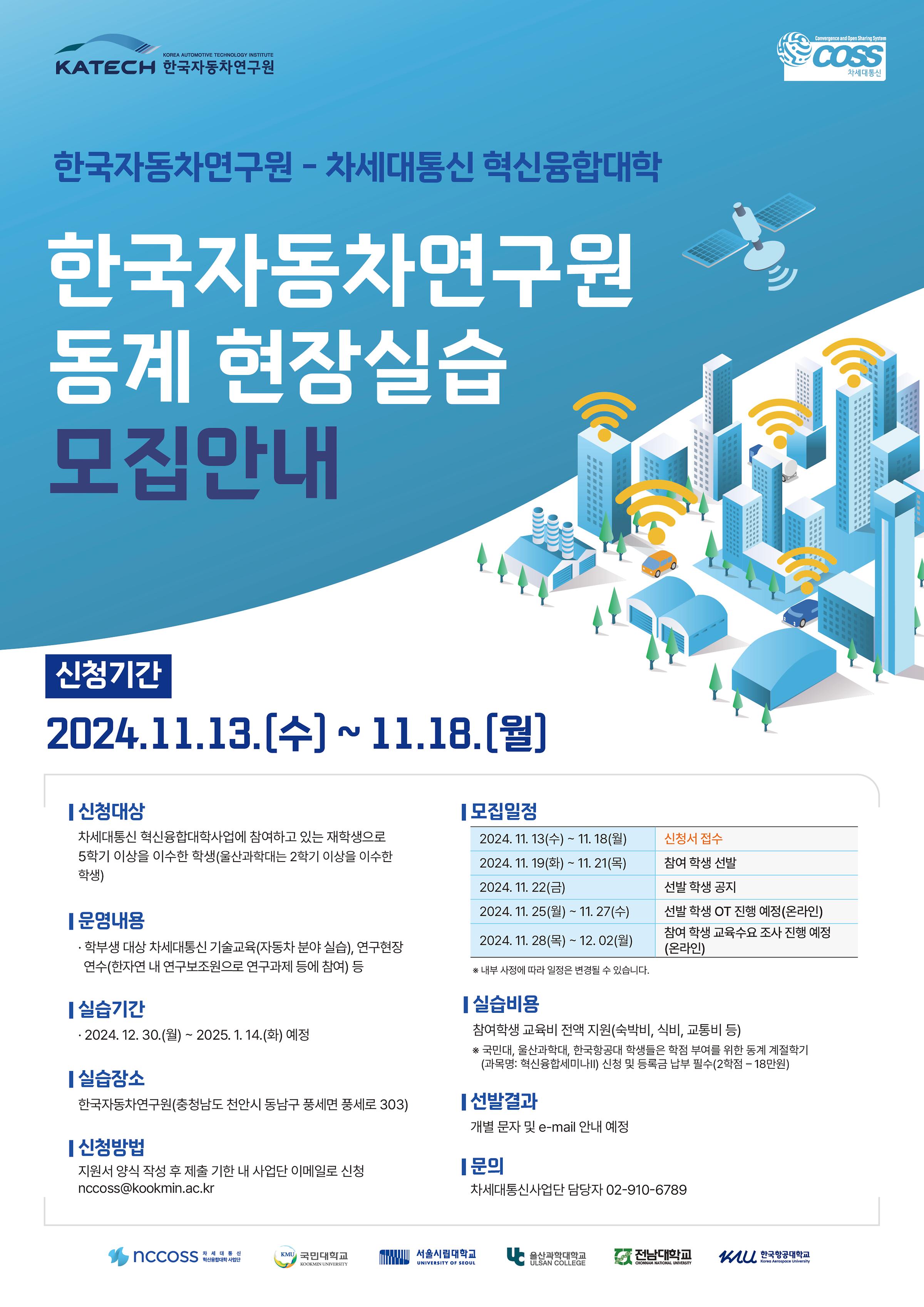 차세대통신혁신융합대학사업단에서는 한국자동차연구원 동계 현장실습 프로그램을 다음과 같이 안내하오니, 많은 관심과 참여 부탁드립니다.